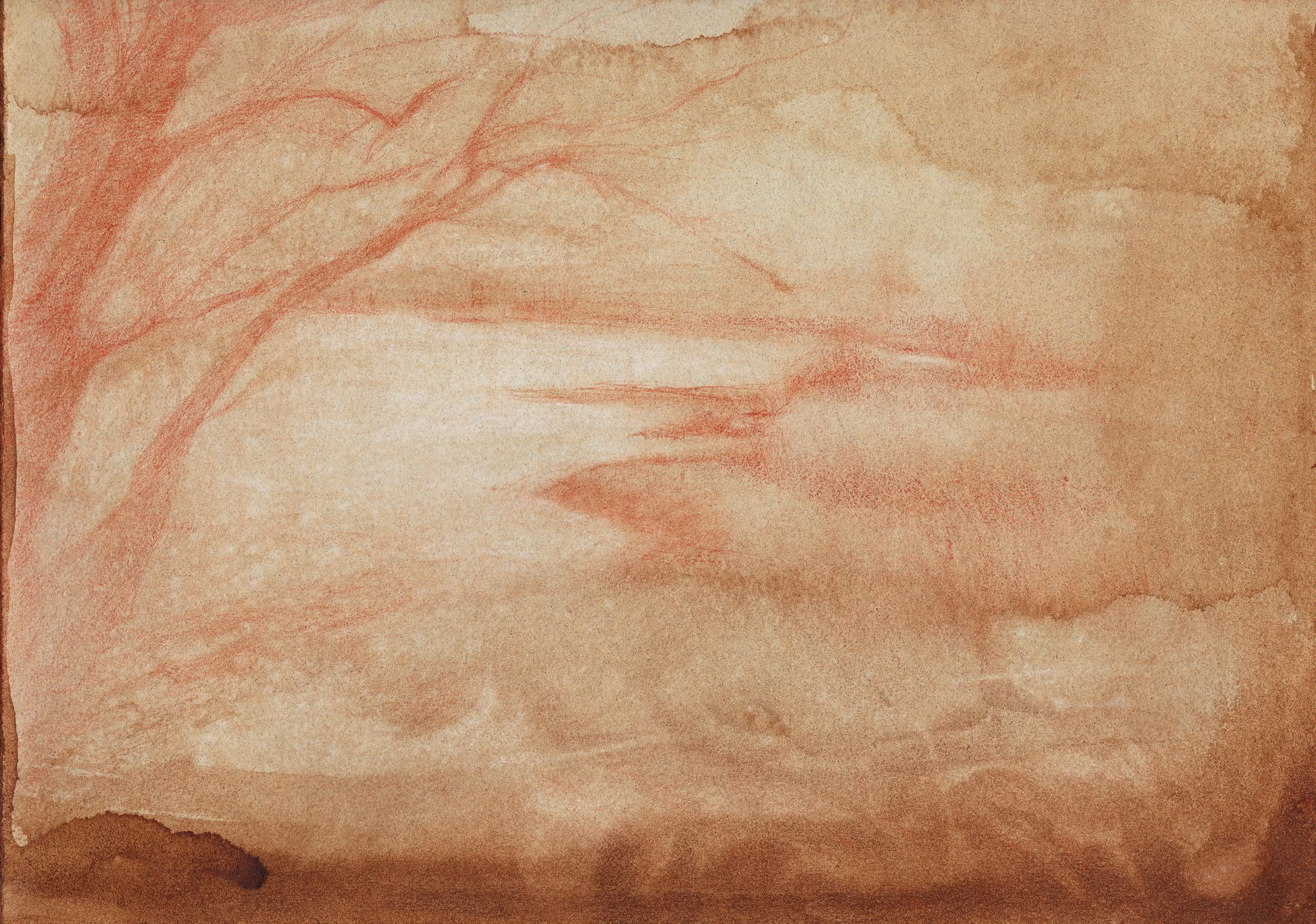 Bay With Estuary King, Red and brown chalk heightened with white on hand-laid hand stained paper.