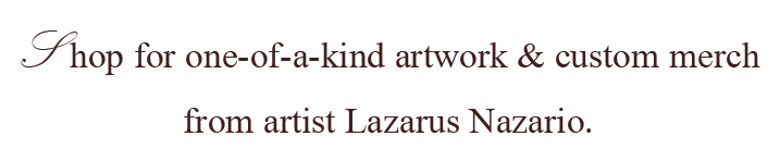 Questions? info@lazarusnazario.com Wildfires Petite Print $45.00 Misty Walk Through the Bois de Boulogne 1 Petite Print $45.00 Misty Walk Through the Bois de Boulogne 2 Petite Print $45.00 Your Mother's Garden Petite Print $45.00 Crash Demon #1 $500.00 Misty Walk Through the Bois de Boulogne 1 $500.00 Sold Out Exorcise Your Demons-"The Kit" $35.00 Official Zero Cop-Out T- Shirts $35.00 Official Fuck Cop-Out T-Shirts $35.00
